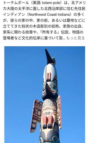 トーテムポール(英語: totem pole)は、北アメリカ大陸の太平洋に面した北西沿岸部に住む先住民インディアン(Northwest Coast Indians)の多くが、彼らの家の中、家の前、あるいは墓地などに立ててきた柱状の木造彫刻の総称。家族の出自、家系に関わる紋章…