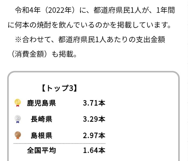 表は少し見づらいですがやはり、焼酎の消費量トップは鹿児島県。種類は不明ですが、多分芋焼酎でしょう。単式蒸留焼酎は鹿児島、宮崎、沖縄が不動ですね。