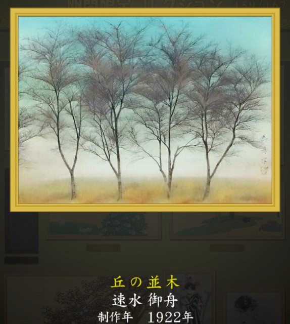 2025-05-09 速水御舟 丘の並木 確か速水御舟の作品で前のスマホの大富豪の景品で持ってた筈、けど、今のスマホは大富豪一から。確かに丘の並木は速水御舟の作品の筈。でも、手持ちの画集には見当たらない。かろうじて、一番下の画風から、速水御舟に間違いない!と確信して、ついに前のスマホから画像を発見。元から画像処理をしたのもでてきました。